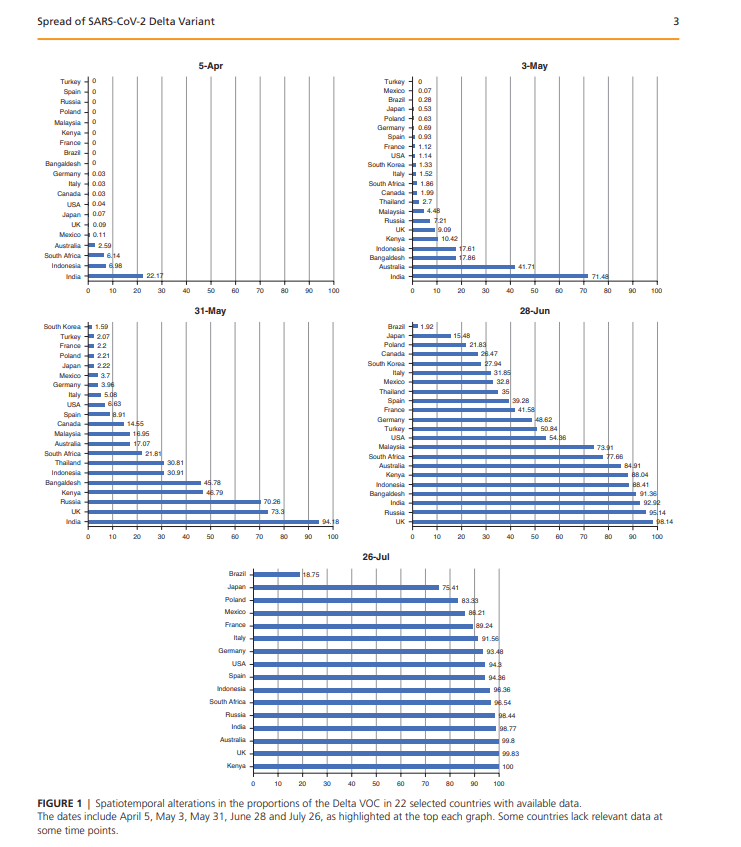 The Delta VOC was first reported in India in December of 2020 and has since affected approximately 130 different countries and regions. Herein, the spatiotemporal spread of the Delta VOC during April to July 2021 in 20 selected countries with available data were analyzed. The prevalence of the Delta VOC sequences was maintained at low levels in the beginning of April, increased rapidly in the following 3 months and is now becoming the predominant viral strain in most regions of the world.